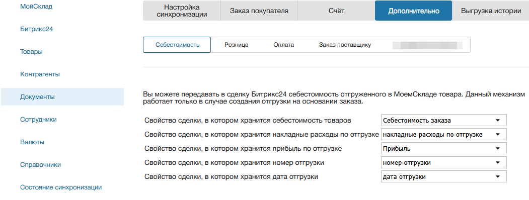 Цена продажи по умолчанию - позволяет указать тип продажной цены, которая будет устанавливаться при открытии закладки МойСклад в сделке Битрик24.