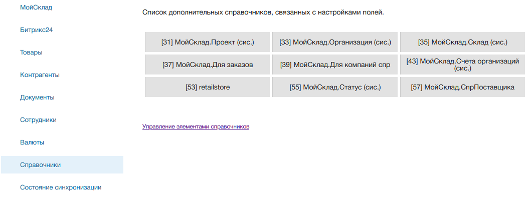 Важно: управление элементами справочника осуществляется только на стороне МойСклад. На стороне Битрикс24 элементы доступны только для чтения. Если Вам нужно обновить элементы справочника в Битрикс24, они обновятся автоматически при следующем обмене, если будут входить в состав обмена.