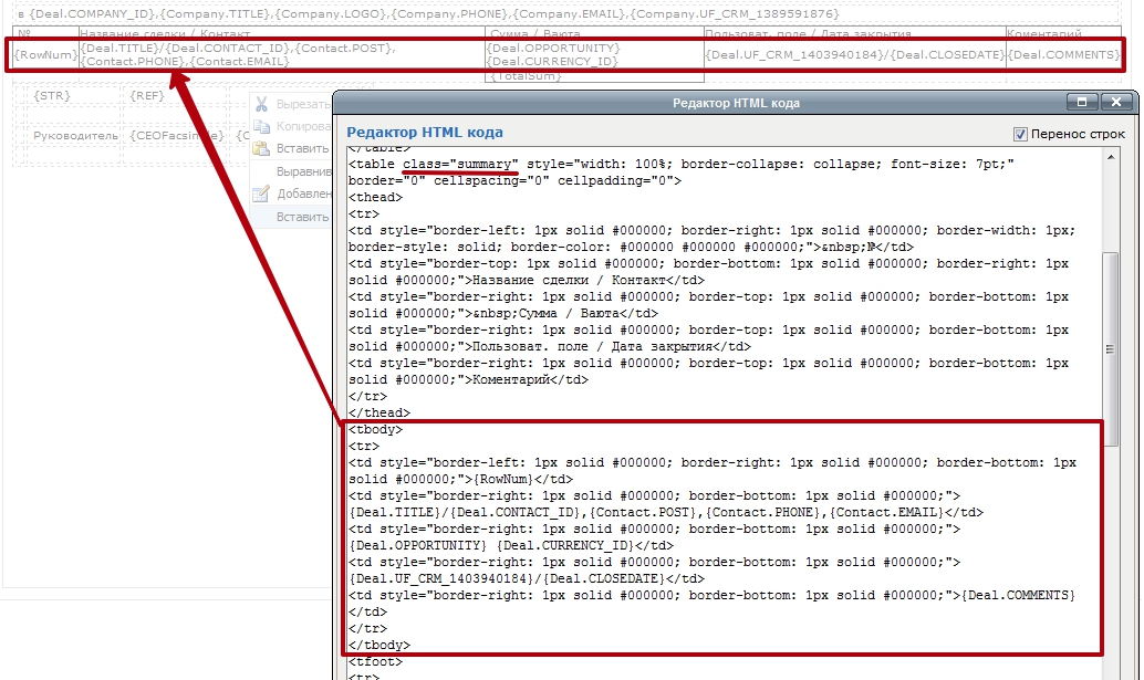 - Строка, содержащая детальные данные по объектам CRM должна быть заключена внутри html-тега <tbody> ... </tbody>. Это так же можно сделать в режиме HTML-редактирования шаблона.