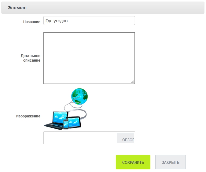 Для элемента справочника можно задать название, описание и картинку. Все эти параметры могут быть использованы для формирования документа.