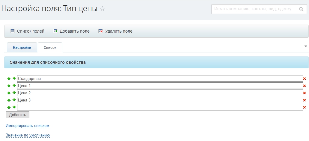 2. Добавьте в объект CRM (сделка, счет, предложение) пользовательское поле с типом "список" и добавьте необходимые значения в список: