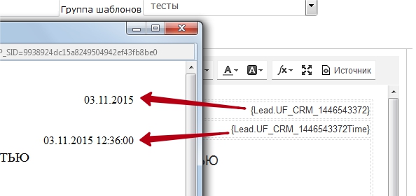 Например, {Lead.UF_CRM_1446543372Time}=03.11.2015 12:36:00