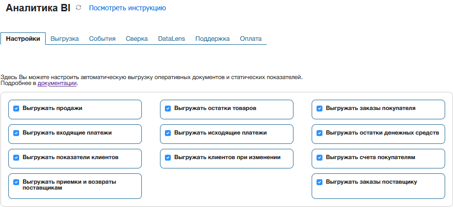 Выгружать остатки товаров - выгрузка текущих товарных остатков. Выгрузка запускается по расписанию один раз в день в 01:30 МСК.