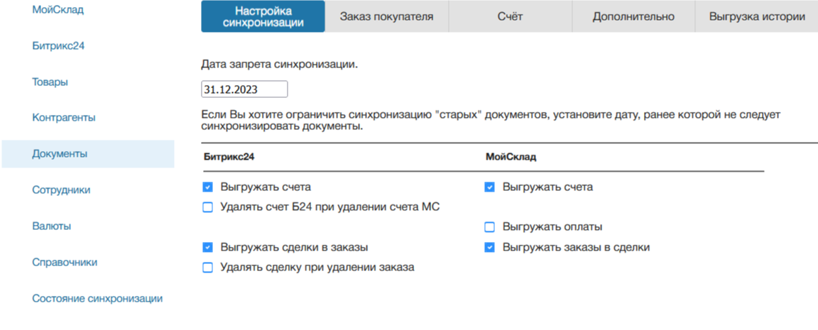 • Битрикс24.Удалять счет Б24 при удалении счета МС - зависимый параметр от МойСклад.Выгружать счета. При включении данной опции и включенной "корзине" в МойСклад при следующем обмене будет предпринята попытка удалить соответствующий счет в Битрикс24.