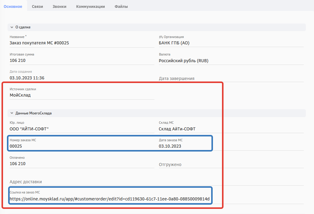 Автоматически создается поле в сделке СБЕР CRM, которое содержит ссылку на заказ покупателя в МоемСкладе.