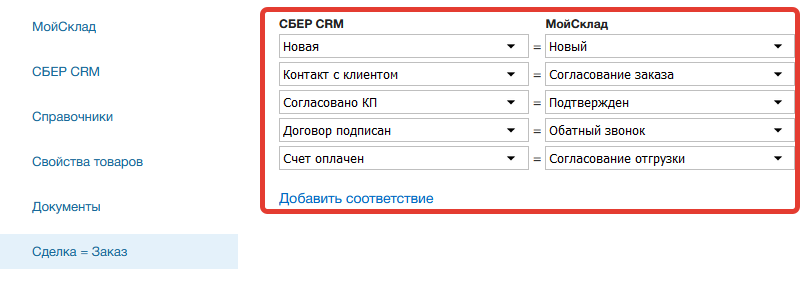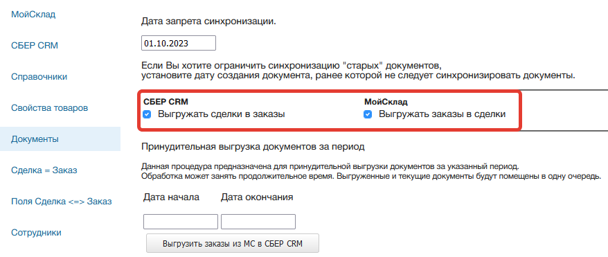 Для выгрузки документов из МоегоСклада или СБЕР CRM необходимо отметить соответствующую опцию. В синхронизации участвуею документы, статусы которых настроены в приложении.