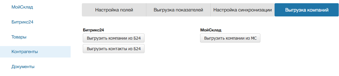 Выгрузить компании из Б24 - данная кнопка используется для ручного запуска загрузки компаний из Битрикс24 в МойСклад. При первом запуске будут выгружены все компании. При следующих запусках будут загружаться только новые и измененные компании, которые появились с момента последнего обмена.