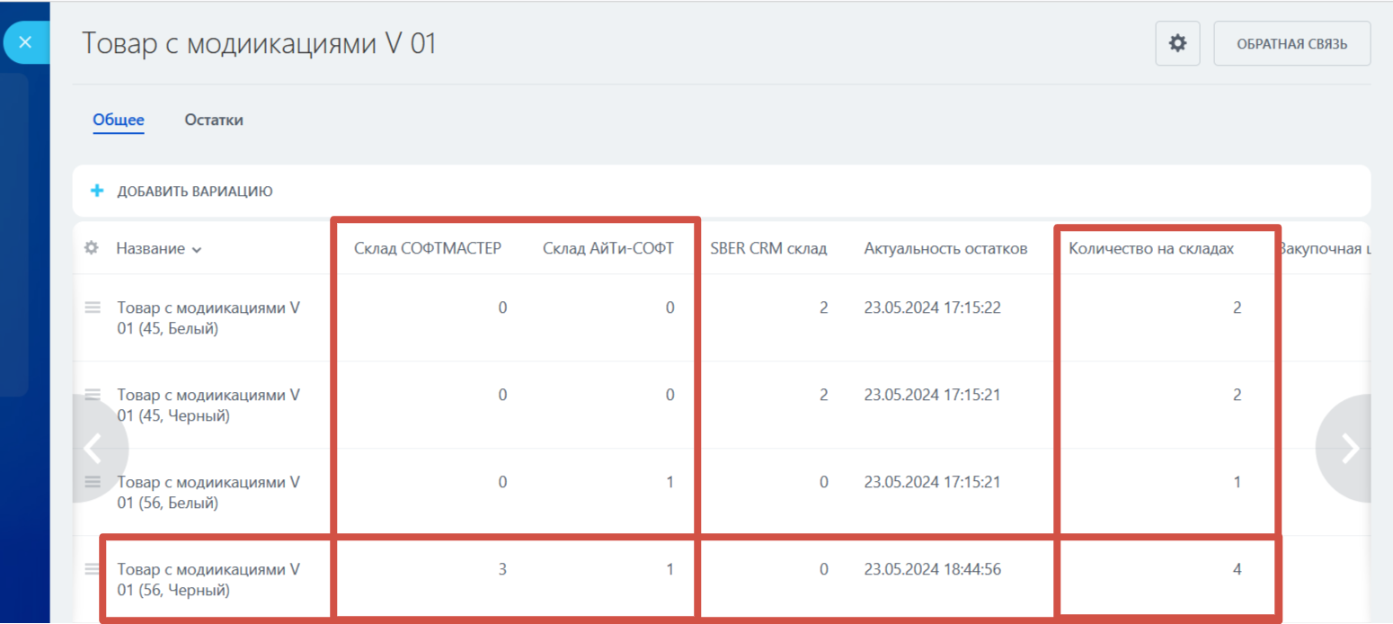Общий остаток синхронизируется в стандартное поле Битрикс24 "Количество на складах". Остатки по каждому складу синхронизируются в пользовательские поля с типом "число". Синхронизация остатков поддерживается как для простых товаров, так и для товаров с модификациями. Синхронизация остатков для комплектов не поддерживается.
