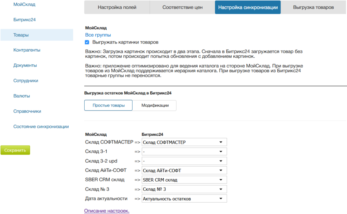 Важно: На текущий момент приложение не работает с складским учетом Битрикс24. Остатки переносятся в Битрикс24 в пользовательские поля.