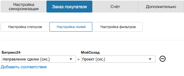Если перед началом синхронизации направления сделок в Битрикс24 и справочник проектов в МойСклад уже содержат значения, рекомендуется привести их наименования в соответствие.