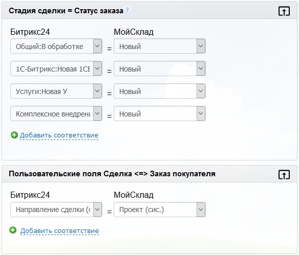 Если перед началом синхронизации направления сделок в Битрикс24 и справочник проектов в МойСклад уже содержат значения, рекомендуется привести их наименования в соответствие.