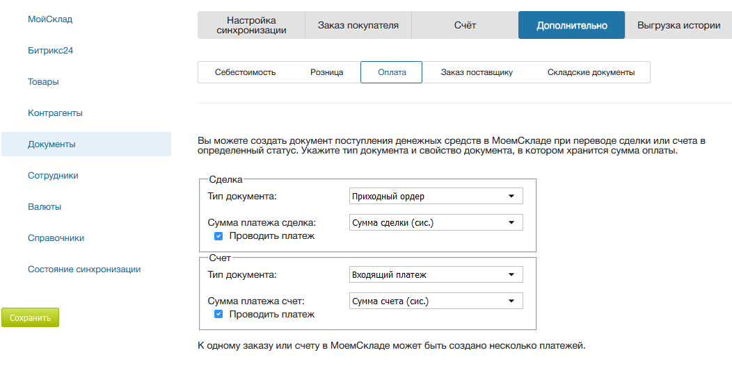 "Входящий платеж" и "Приходный ордер" при переводе сделки или счета в определенную стадию.