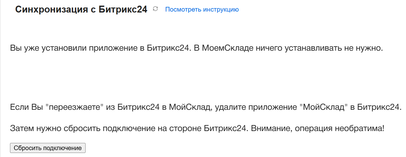 Внимание! Обязательно удалите старое приложение "МойСклад" в списке установленных приложений в Битрикс24. Если после миграции Вы случайно откроете его в Битрикс24, процесс синхронизации данных может быть остановлен.