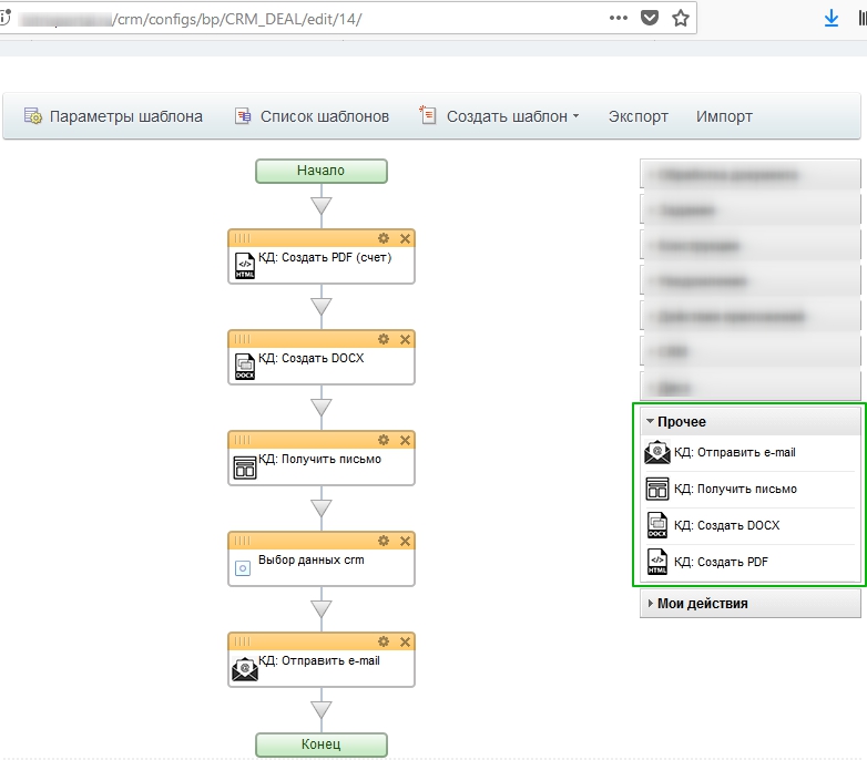Мы используем четыре действия, которые находятся в блоке "Прочее". Для удобства их можно перенести в блок "Мои действия".