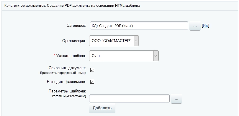 На основании HTML- шаблона можно создать PDF документ. Документу можно присвоить порядковый номер и наложить факсимиле руководителя и главного бухгалтера.