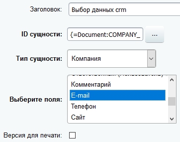 В качестве получателя можно указать результат выполнения действия "Выбор данных crm"