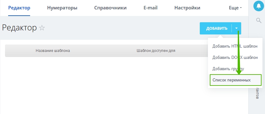 Откройте редактор, нажмите кнопку "Добавить", в выпадающем меню выберите "Список переменных".