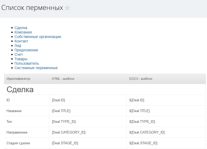 Будет сформирован список всех доступных переменных. Вы можете перейти к любому блоку, используя оглавление в начале страницы.