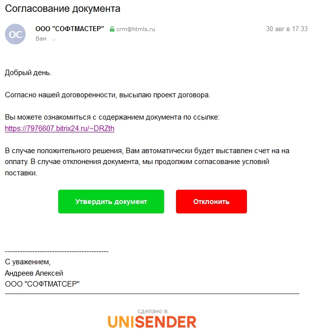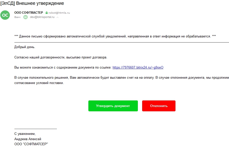 В результате работы действия внешний пользователь получит электронное письмо, которое будет содержать ссылки для перехода на форму утверждения или отклонения документа.