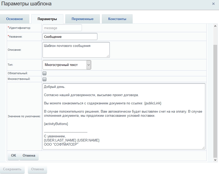 В качестве шаблона почтового сообщения можно использовать переменную с типом "Многострочный текст"