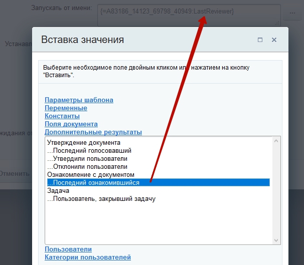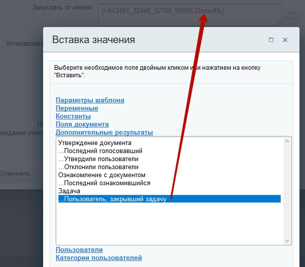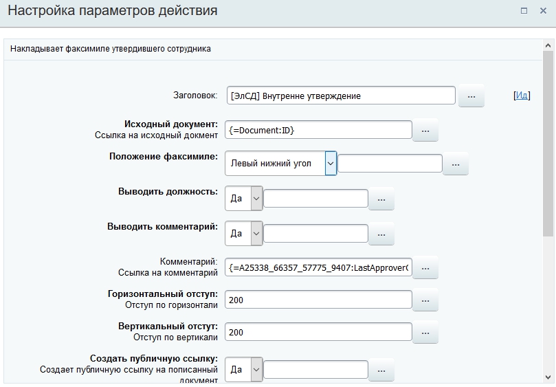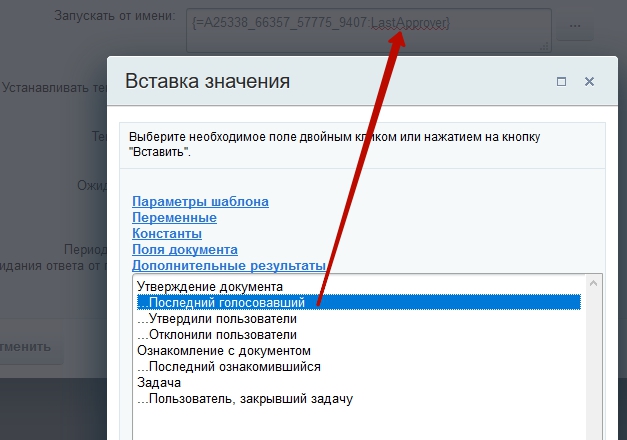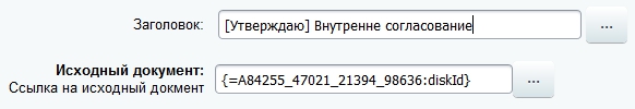 Например, для наложения второй резолюции на документ можно использовать ссылку на документ, созданный на первом шаге. В этом случае параметр "Исходный документ" принимает значение, подобное {=A84255_47021_21394_98636:diskId}.