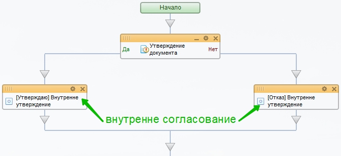 Действие "Внутренне согласование" располагается после блока "Утверждение документа".