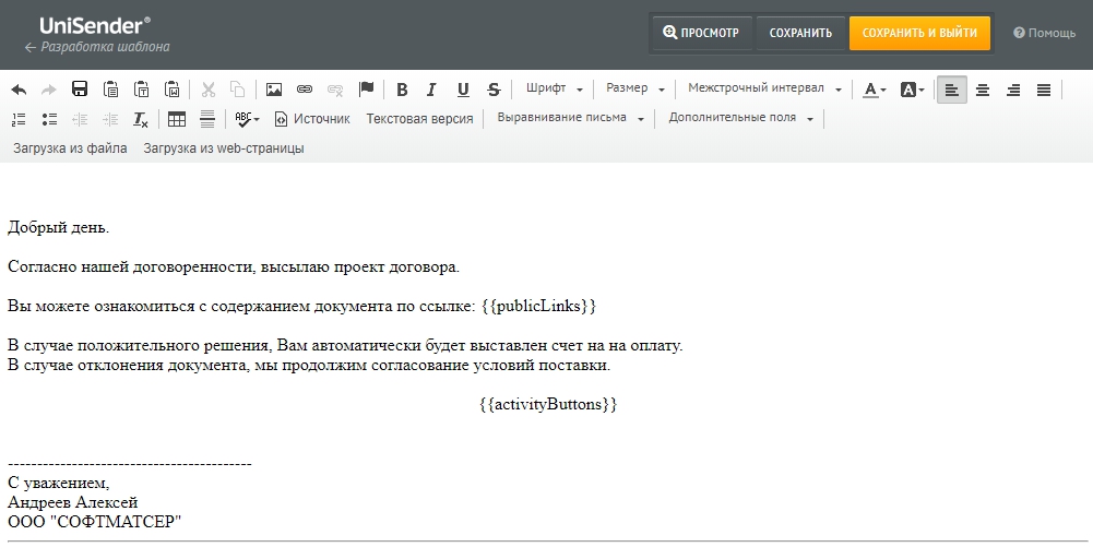 {activityButtons} - место для размещения кнопок. Если переменная не указана, кнопки будут добавлены в конец письма.