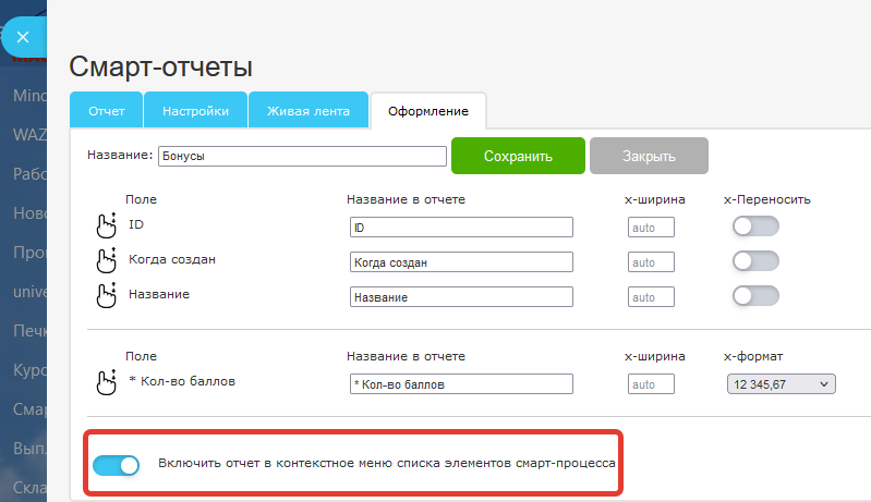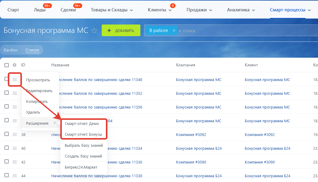 При "Включении отчета в контекстное меню списка элементов смарт-процесса" данный отчет будет доступен для формирования и редактирования (при наличии прав) в списке элементов смарт-процесса.