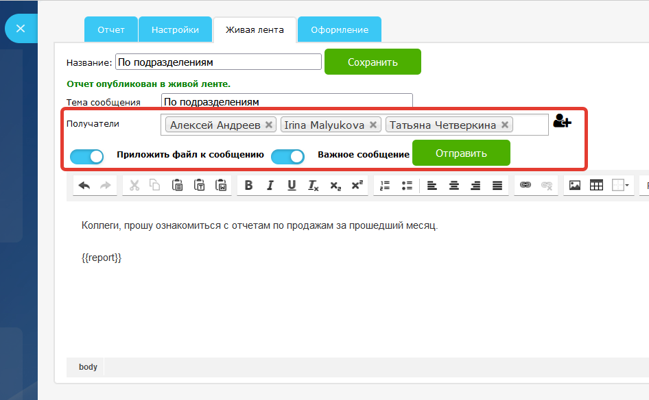 - Публикация в живую ленту. Удобная коммуникация с коллегами, возможность совместно работать над данными отчета и предлагать новые сценарии развития. Отчет может быть опубликован непосредственно в сообщении и прикреплен файлом.