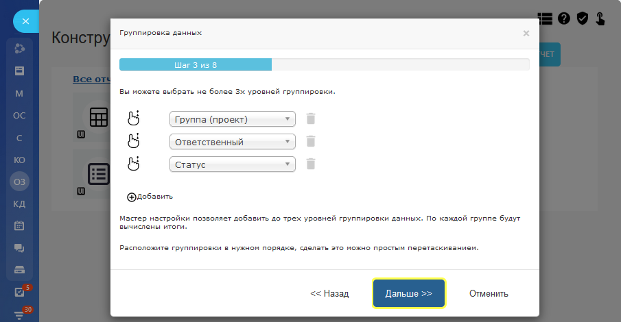 Настройка отчета. В панели настроек можно управлять уровнями группировок данных, выводом колонок и полями для отбора данных.