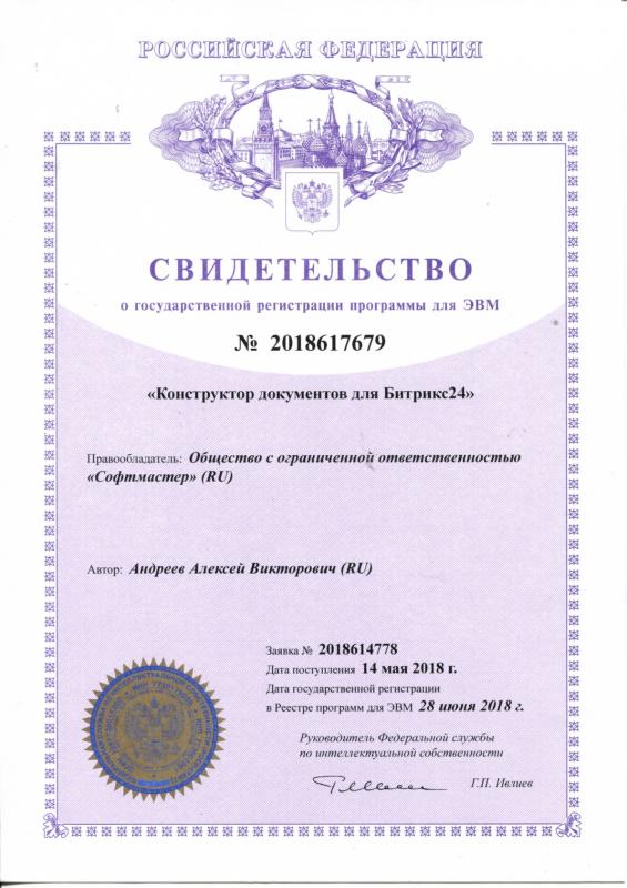 "Конструктор документов для Битрикс24" прошел официальную регистрацию в качестве программы для ЭВМ.
